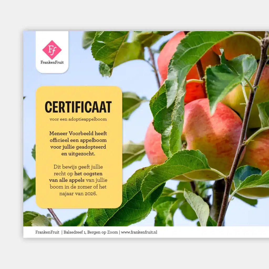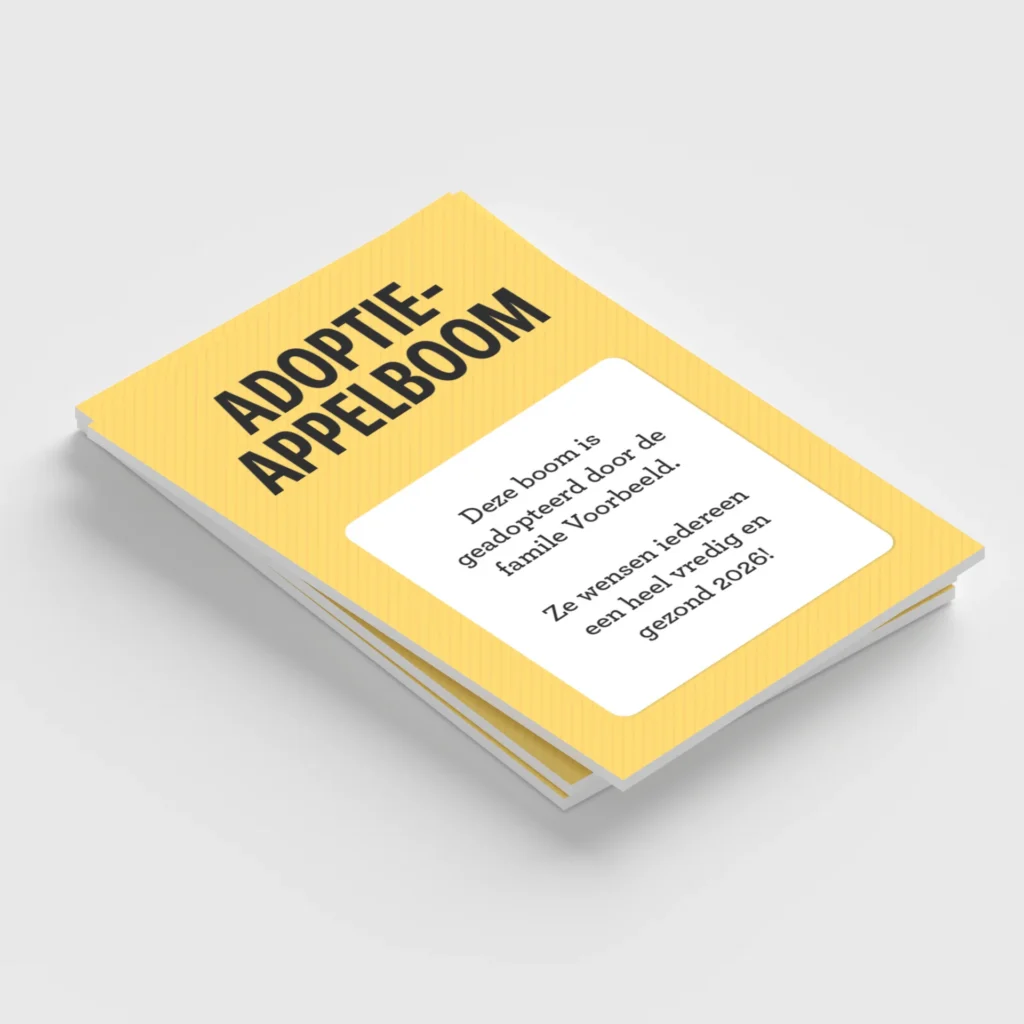 Wilt u een adoptieappelboom cadeau geven? Ook dat kan! Na uw bestelling ontvang u het certificaat. Met de QR code die daarop staat kunt u uw naambordje personaliseren. U kunt dit zelf doen, of dat overlaten aan de persoon aan wie u het schenkt.