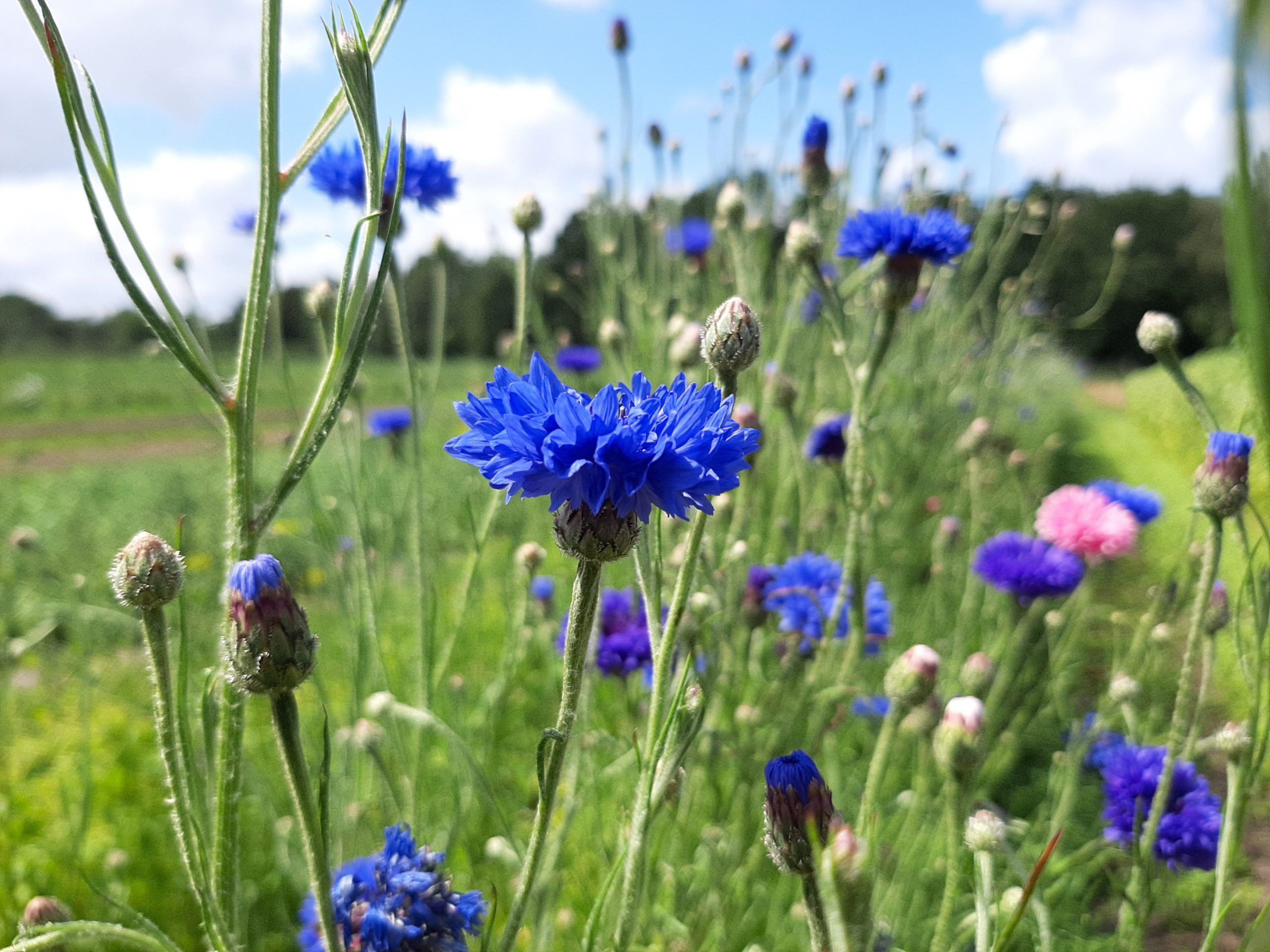 De combinatie van korenbloemen en cosmea zorgt voor een speels en zomers geheel. Met hun lichte vormen en frisse kleuren geven ze een luchtig veldboeket-karakter.