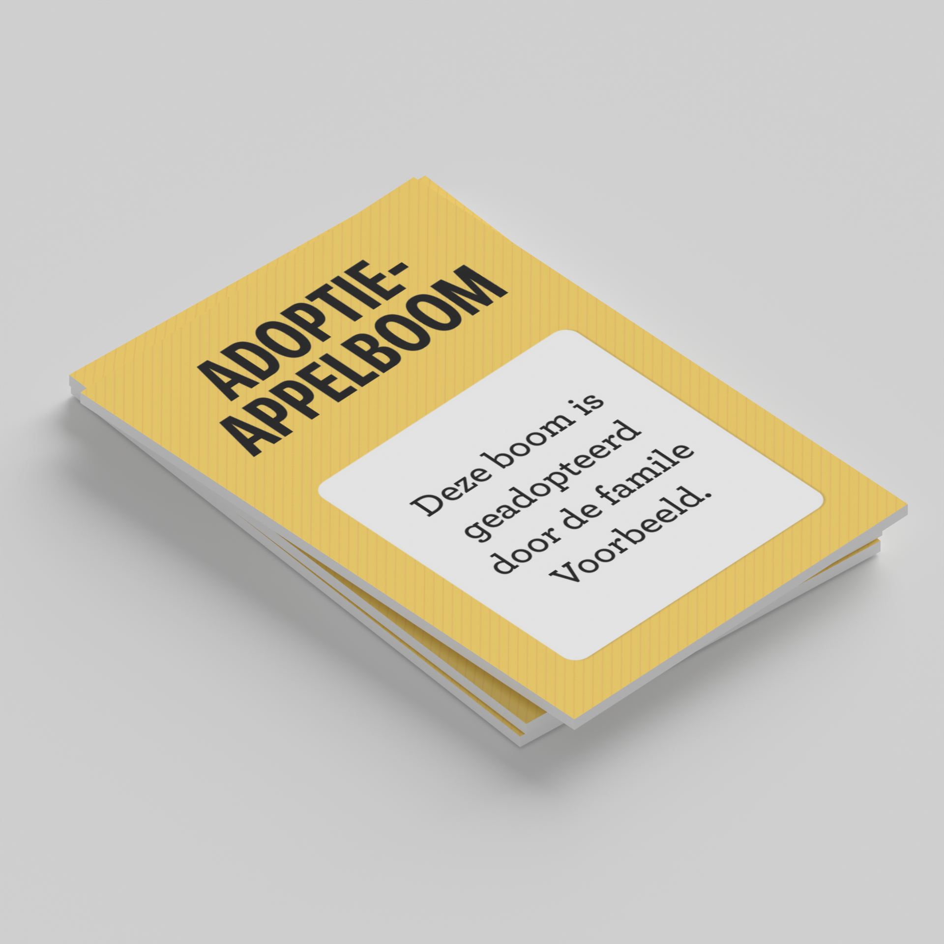 Standaard staat op het bordje: “Deze boom is geadopteerd door […]”. Daaronder kunt u nog een extra tekst ingeven, als u wil.